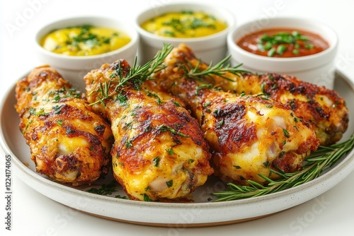 Delicious Grilled Chicken Drumsticks with Various Dipping Sauces on a Rustic Serving Plate