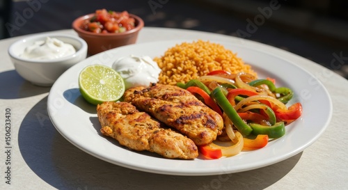 Delicious Grilled Chicken Fillet with Colorful Vegetables, Savory Rice, and Fresh Lime on a Bright Table Setting Perfect for Dining Experience