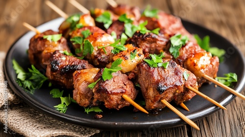Delicious grilled meat skewers garnished with fresh herbs on a rustic wooden table.