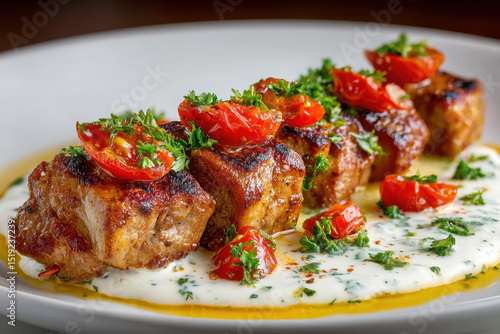 grilled, meat, skewer, tomatoes, herb, sauce, plate, food, cookery, epicure, cooking, meal, dinner, fresh, savoury, presentation, culinary, eatery, dish, favor, garnish, parsley, cherry, red, healthy, protein, bar-b-q, roasted, seasoning, platter, delicious, tasty, organic, homemade, vibrant, colourful, ingredient, dining, chef