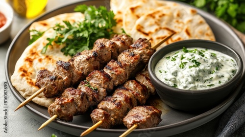 Delicious Grilled Meat Skewers with Tzatziki Sauce and Pita Bread