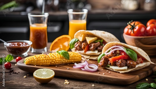 food, meat, enclosed, grilled, bread, tomatoes, corn, cob, onion, red, orange, basil, vegetable, dinner, lunch, healthy, cookery, tasty, appetising, delicious, fresh, meal, diet, eat, favor, ingredient, homemade, receipe, savoury, plate, kitchen, cooking, kitchen utensile, cutting, board, wooden, glasses, juice, drink, beverage, sauce, spice, seasoning, pepper
