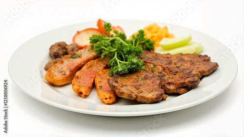 Delicious Grilled Pork Chops with Sausages and Vegetables on a White Plate