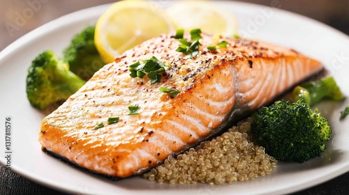 Delicious grilled salmon fillet with quinoa and broccoli on a white plate
