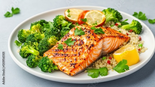 Delicious grilled salmon served with broccoli, quinoa, and lemon, garnished with fresh herbs on a white plate.