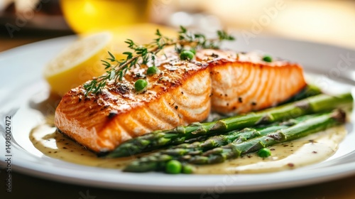 Delicious grilled salmon with asparagus, lemon wedge, and fresh herbs.