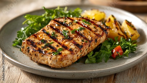 Delicious grilled salmon with fresh vegetables and citrus