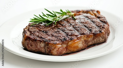 Delicious grilled steak served on a white plate with fresh rosemary garnish