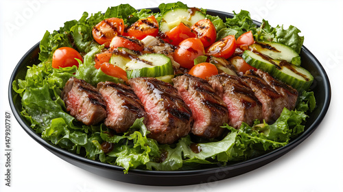 Delicious grilled steak served on fresh salad with tomatoes and cucumbers, creating vibrant and healthy meal option