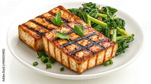 Delicious grilled tofu steaks are served on a white plate with fresh green chard and garnished with parsley, a healthy and tasty vegetarian meal, closeup shot.
