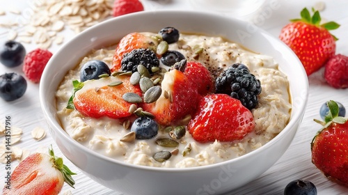 oatmeal, breakfast, berry, strawberry, blueberry, blackberry, raspberry, nut, seed, health food, bowl, natural, ingredient, dietary, nourishment, meal, wholesome, cooking, culinary, closeup, appetising, texture, freshness, creamy, rustic, seasonal, vibrant, colourful, delicious, snack, energy, organic, vegetarian, vegan, morning, kitchen, table, lifestyle, serving, nourishment, fuel, epicure, health, balanced diet