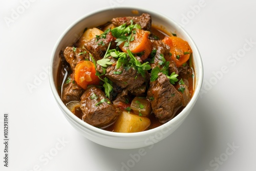 Delicious Hearty Beef Stew in Bowl on White Background with Copy Space
