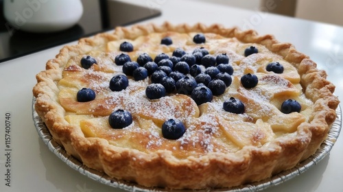 Delicious homemade apple pie topped with fresh blueberries and a golden shortcrust pastry presented on a clean kitchen countertop.