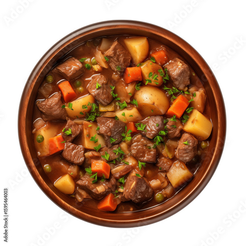 Delicious homemade beef stew recipe with potatoes and carrots in wooden bowl on transparent background
