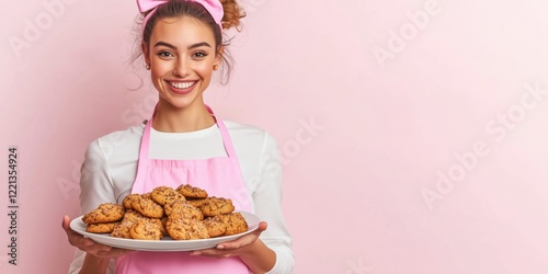 Delicious homemade cookies presented by smiling woman in pink apron and bow, perfect for dessert lovers and baking enthusiasts