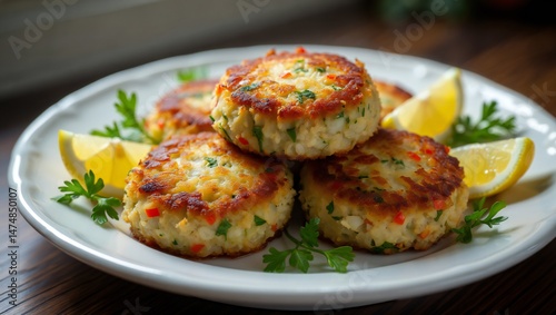 Delicious Homemade Crab Cakes Garnish with Lemon and Parsley
