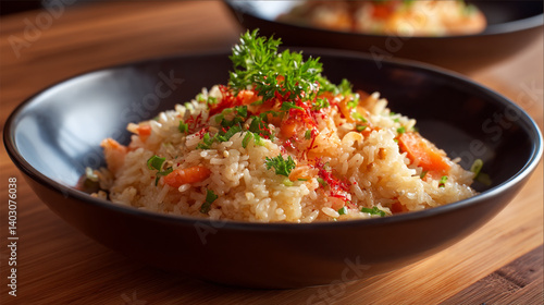 Delicious homemade fried rice recipe with fresh vegetables in a black bowl on wooden table top view