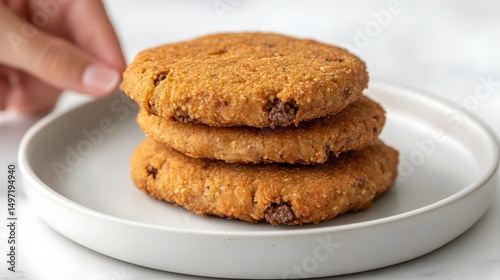 cookie, chocolate chips, food photography, snack, bakery, baking, food, plate, tasty, sweet, delicious, homemade, brown, chocolate, chips, oatmeal, stack, treat, closeup, hand, grabbing, picking, epicure, artisan, pastry, white plate, rustic, texture