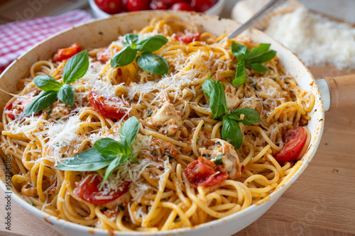 food, meal, dish, pasta, spaghetti, noodle, noodle, dinner, lunch, pan, frying pan, frying pan, italian, cookery, kitchen, cooked, homemade, cooking, receipe, background, tomatoes, caprese, cheese, mozzarella, parmesan, pine nut, garnish, basil, pesto, prepared, ready to eat, closeup, delicious, tasty, summer, main course