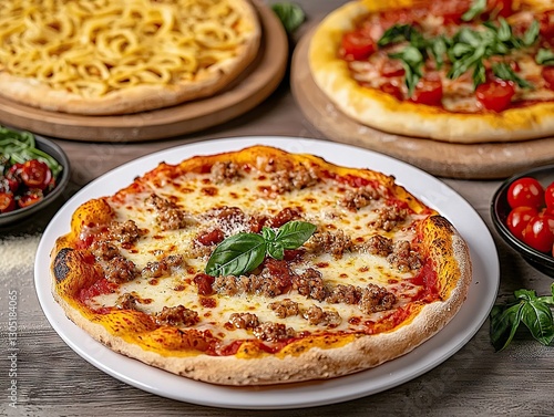 Delicious homemade pizza with sausage and basil kitchen table food photography cozy environment close-up view