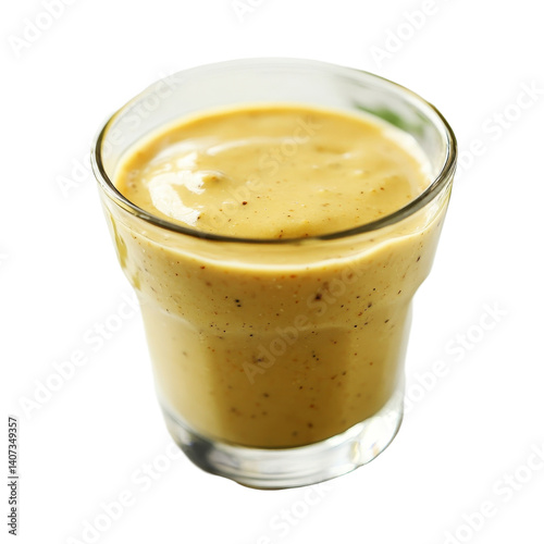 Delicious honey mustard sauce in a glass against a clean transparent background with green garnish, Honey mustard sauce in a glass on a transparent background