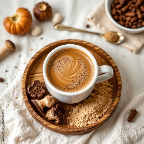 Delicious hot coffee with frothy top served in a white cup on a wooden plate surrounded by cookies spices and ingredients on a white tablecloth