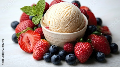 Delicious ice cream scoop surrounded by fresh strawberries and blueberries on a light background