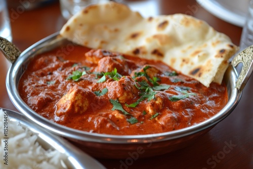 butter, chicken, bread, curry, indian, food, dish, meal, dinner, lunch, cookery, spicey, savoury, tomatoes, sauce, creamy, rich, fragrant, flavorful, delicious, aromatic, comforting, hearty, warm, plate, bowl, metal, cilantro, parsley, herb, garnish, eatery, traditional, authentic, vegetable, pepper, spice, ginger, garlic, eastern, oriental, tasty, deliciously, healthy, protein