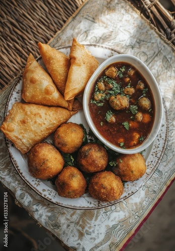 samosa, platter, appetiser, crispy, savoury, herb, snack, fried, vegetarian, meal, cookery, traditional, spice, flavorful, food photography, garnishing, table setting, rustic, homemade, curry, delicious, presentation, comforting, cultural, culinary, tasty, receipe, side dish, golden brown, fried, culinary arts, brunch