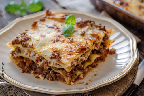 Delicious italian lasagna bolognese presenting layers of pasta, meat sauce, and cheese