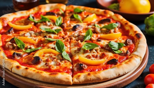 Delicious Italian Pizza With Basil And Yellow Pepper Toppings Ready To Serve