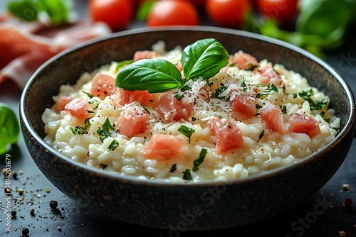 Delicious italian risotto garnished with fresh basil leaves and tomatoes served in a bowl