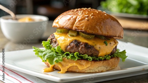 Delicious Juicy Cheeseburger with Pickles and Melted Cheese on a Sesame Seed Bun