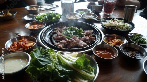 bar-b-q, food, dining, cookery, meal, grill, meat, vegetable, table, smoke, korean, fresh, salad, herb, sauce, home cooking, cooking, tasty, eating, epicure, eatery, tradition, family, friends, culture, enjoyment, utensil, metal, bowl, condiment, feast, favor, ingredient, preparation, sharing, warmth, gathering, lunch, dinner, vibrant, lifestyle, savoury, cookware