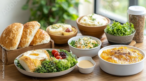 food, meal, korean, cookery, table, breakfast, salad, vegetable, egg, bread, herb, cream, sauce, bowl, ingredient, culinary, dining, fresh, homemade, epicure, nourishment, delicious, comfort, green, snack, side dish, variety, presentation, cooking, wooden