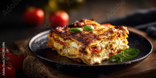 Delicious Lasagna on a Black Plate Garnished with Basil, Representing Comfort Food and Family Gatherings, Perfect for Restaurant Menu Design and Food Blog Content : Generative AI