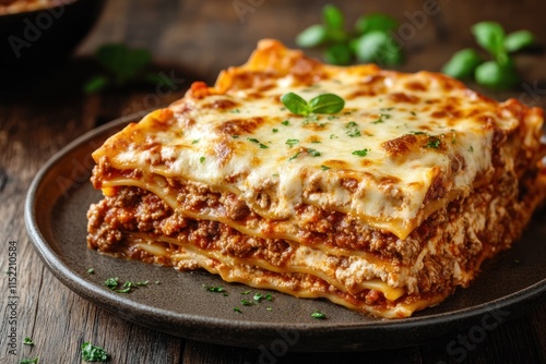 Delicious Lasagna Slice Served on Dark Plate