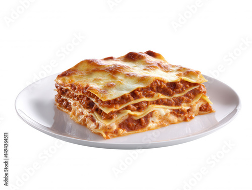 Delicious lasagna with rich meat sauce and melted cheese is beautifully plated on a white dish and isolated against a clean white background, inviting a hearty meal.