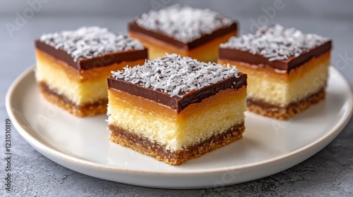 Delicious Layered Coconut Chocolate Cake Squares on White Plate with Gray Background