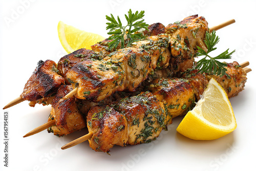 Delicious lemon herb chicken kababs grilled to perfection on white surface
