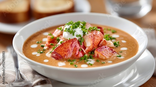 lobster, soup, cream, chives, seafood, fresh, culinary, epicure, bowl, meal, dinner, food, tasty, ingredient, receipe, eatery, kitchen, cookery, colourful, homemade, comfort, hot, serving, elegant, dining, broth, rich, healthy, presentation, favor, garnish, delicious, warm, creamy, aroma, rustic, iconic, feast, dish, spoon, lunch, visual