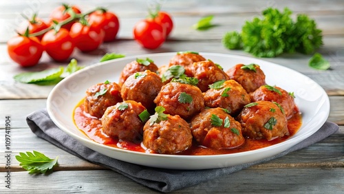 Delicious meatballs in rich tomato sauce on a white plate, meatballs, food, Italian cuisine, savory, homemade, traditional