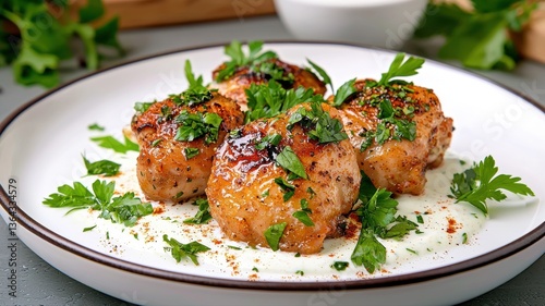 Delicious meatballs served with creamy sauce and fresh herbs on a white plate.