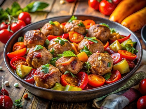 Delicious Meatballs with Roasted Vegetables: A Vibrant Food Photography Stock Image