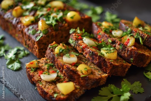 Delicious meatloaf garnished with herbs and fresh vegetables on a black slate platter