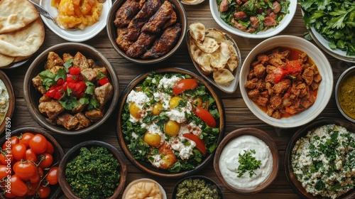 food, meal, table, cookery, platter, ingredient, fresh, vegetable, herb, chicken, dip, olive, bread, yogurt, tomatoes, greener, spice, sauce, healthy, dining, sharing, colourful, cultural, homemade, cooking, traditional, variety, nourishment, salad, tasty, garnish, favor, arrangement, breakfast, lunch, dinner, mediterranean, organic, culinary, presentation, epicure, feast, occasion, vibrant, life events, enjoyment