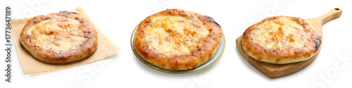 Delicious Megrelian khachapuri isolated on white, set