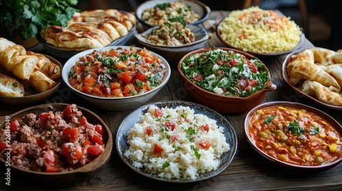 feast, table setting, wooden table, food photography, appetiser, salad, rice