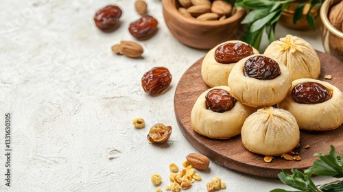 Delicious Middle Eastern Cookies with Dates and Nuts on Wooden Plate Surrounded by Fresh Ingredients