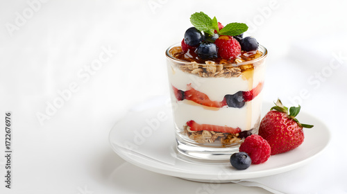 Delicious Mixed Berry Parfait with Yogurt and Granola Served in a Glass Bowl on a White Plate